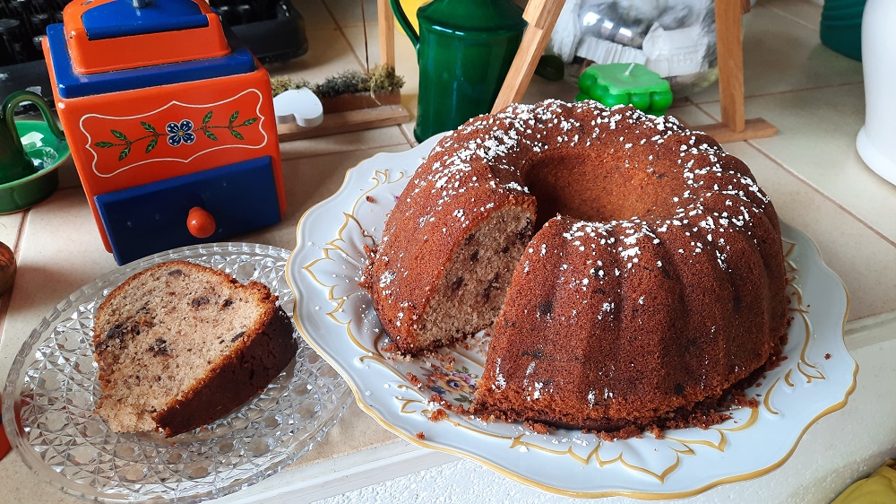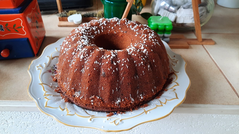 Einen Rührkuchenteig herstellen, in eine gebutterte Gugelhupfform geben, backen bei 180 Grad ca. 45 Minuten, auskühlen lassen.