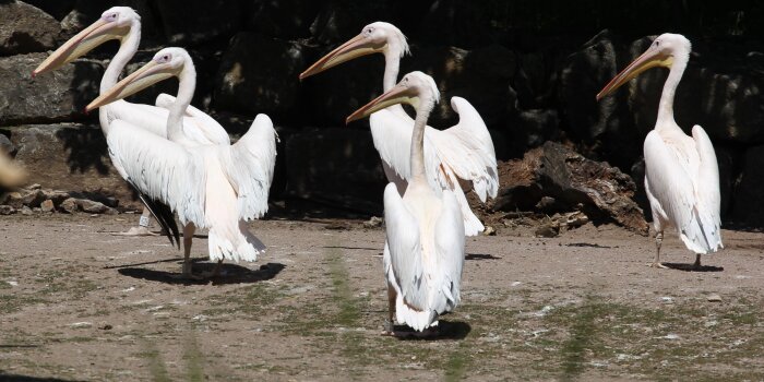 Rosapelikane sind weit verbreitet und für Zoobesucher dennoch etwas ganz Besonderes. Sie leben in Südosteuropa, West-, Zentralasien, und Südasien, Westarabien und in Afrika. Sie sind koloniebildende Bodenbrüter, die sich hauptsächlich von Fisch ernähren und vorzugsweise in Flussniederungen, Deltas und Seen, gelegentlich auch an der Küste leben. Den gut 160 Quadratmeter großen Teich der Erfurter Afrikasavanne hat die muntere Truppe zwar schon entdeckt, aktuell finden sie die Felsen und Sandliegeplätze aber wesentlich interessanter.