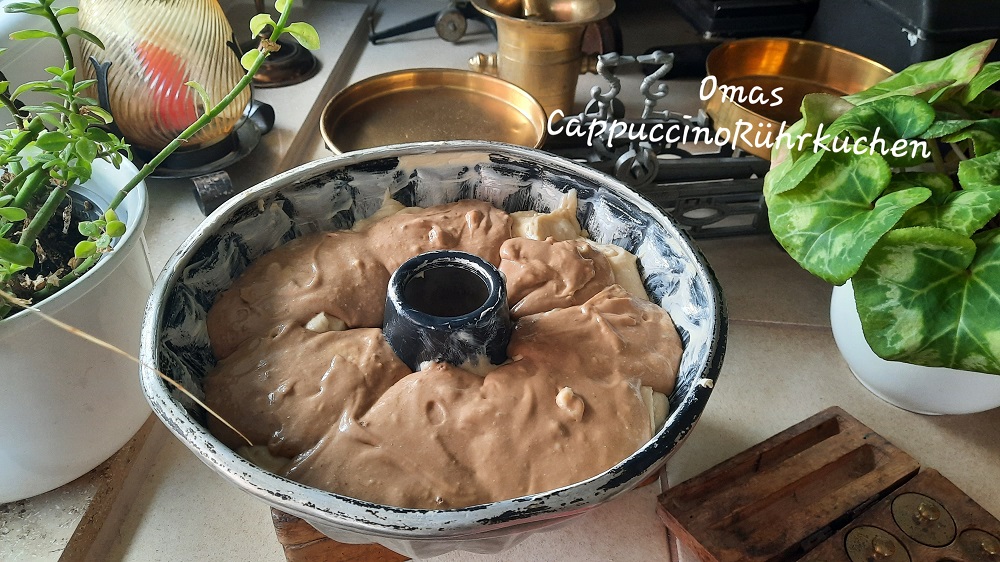 Butter und Zucker schaumig rühren, Eier einzeln unterrühren, Vanillezucker zugeben, vorsichtig Milch, Mehl und Backpulver unterheben. ¾ vom Teig in eine gebutterte Form geben, in das letzte Drittel Joghurt und Cappuccinopulver einrühren, auf den hellen Teig klecksen, ca. 50 Minuten bei 175 Grad backen. Stäbchenprobe!!!!!