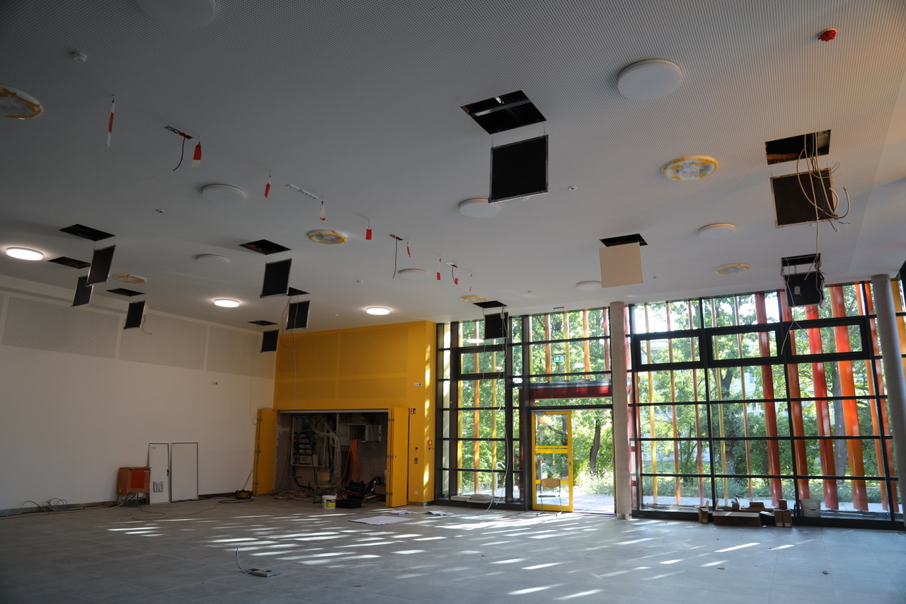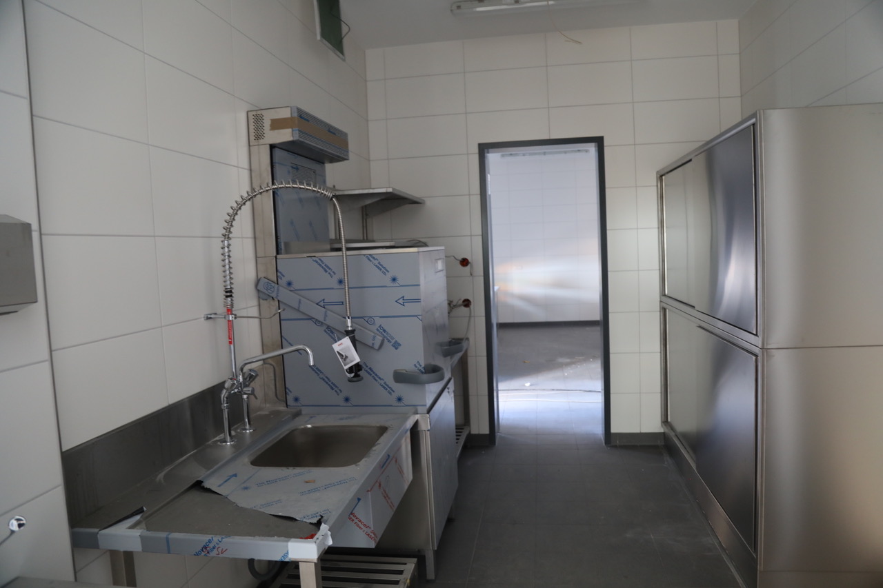 Die neue Mensa ist verbunden mit dem Schulbau und in diesem Verbindungstrakt befindet sich die technisch bereits ausgestattete Küche.
