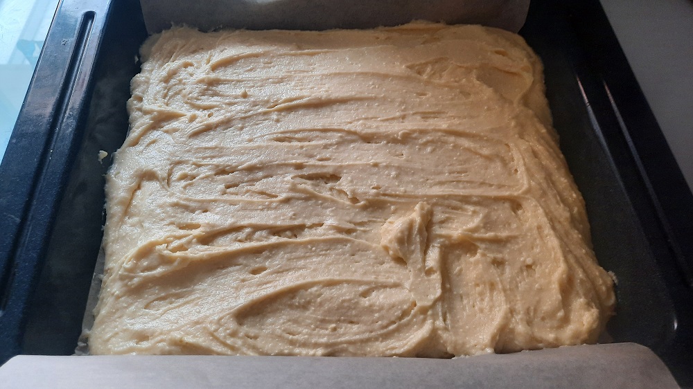 Butter und Zucker cremig aufschlagen, die Eier nacheinander unterrühren. Zitronenschale und Saft zugeben. Mehl, Backpulver und Kartoffelmehl kräftig unterrühren und den Teig auf ein ausgelegtes Blech (29x32cm) streichen.