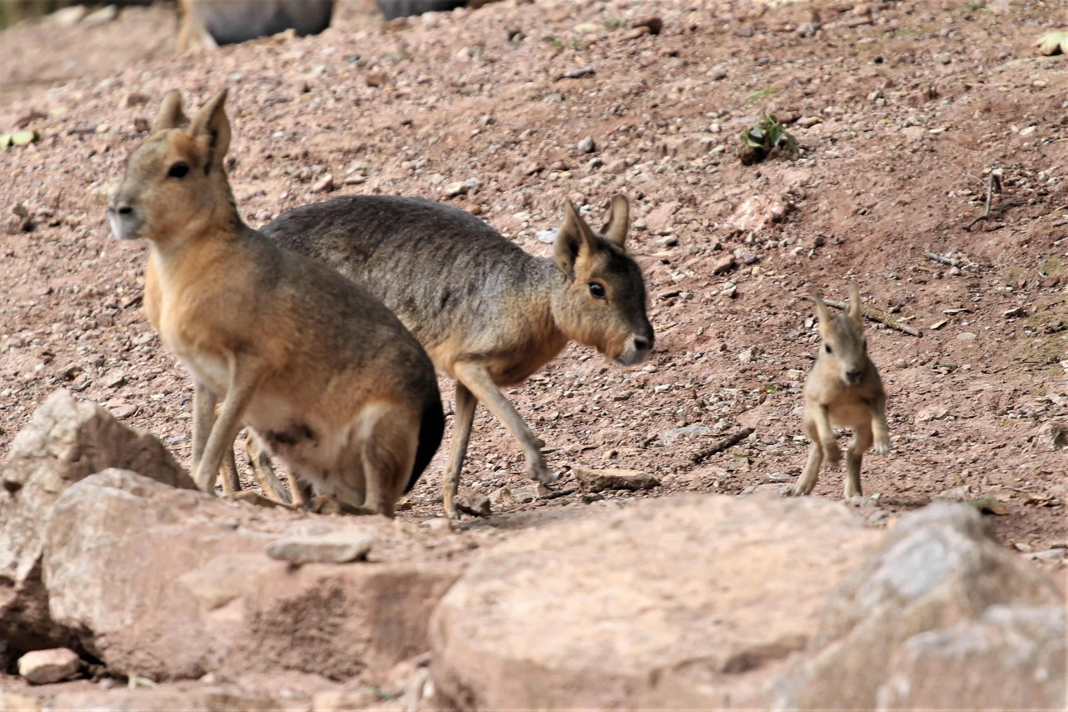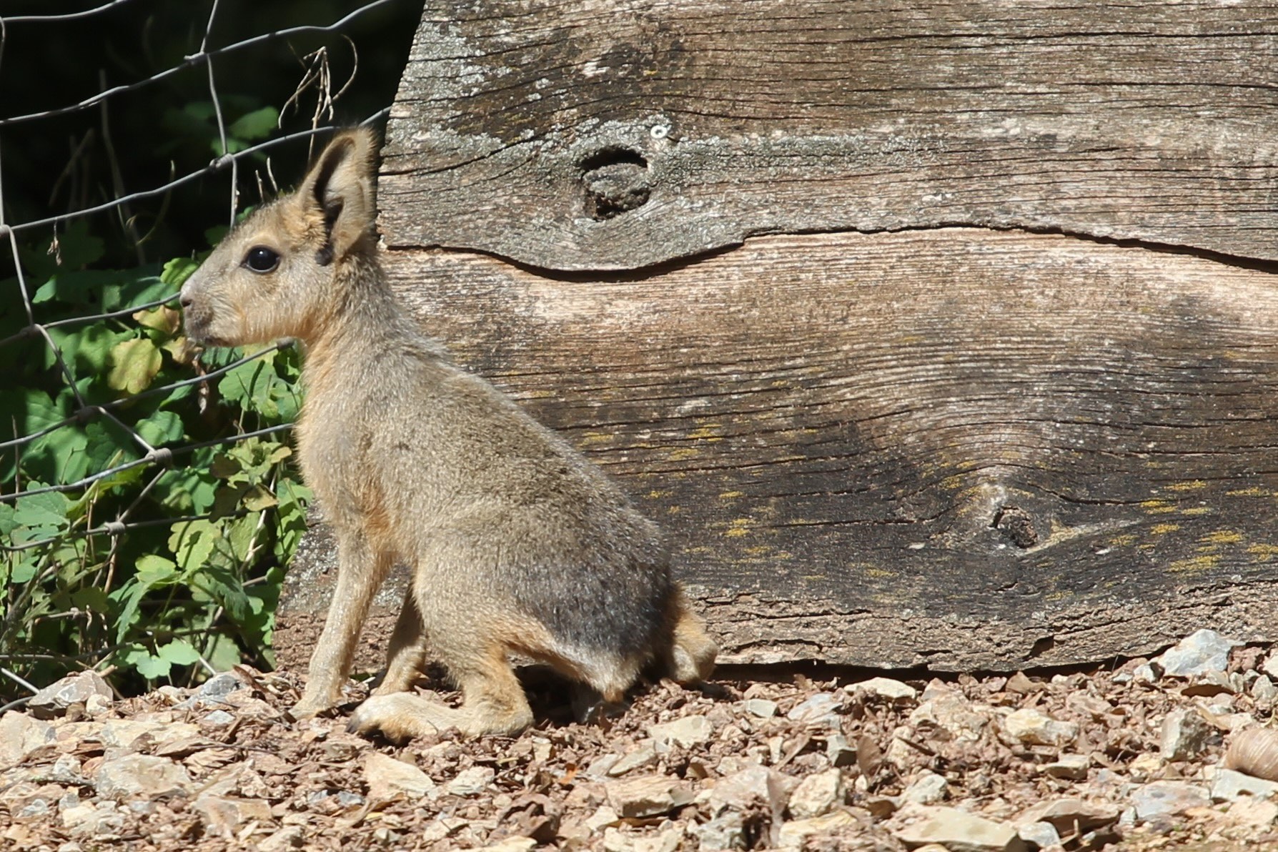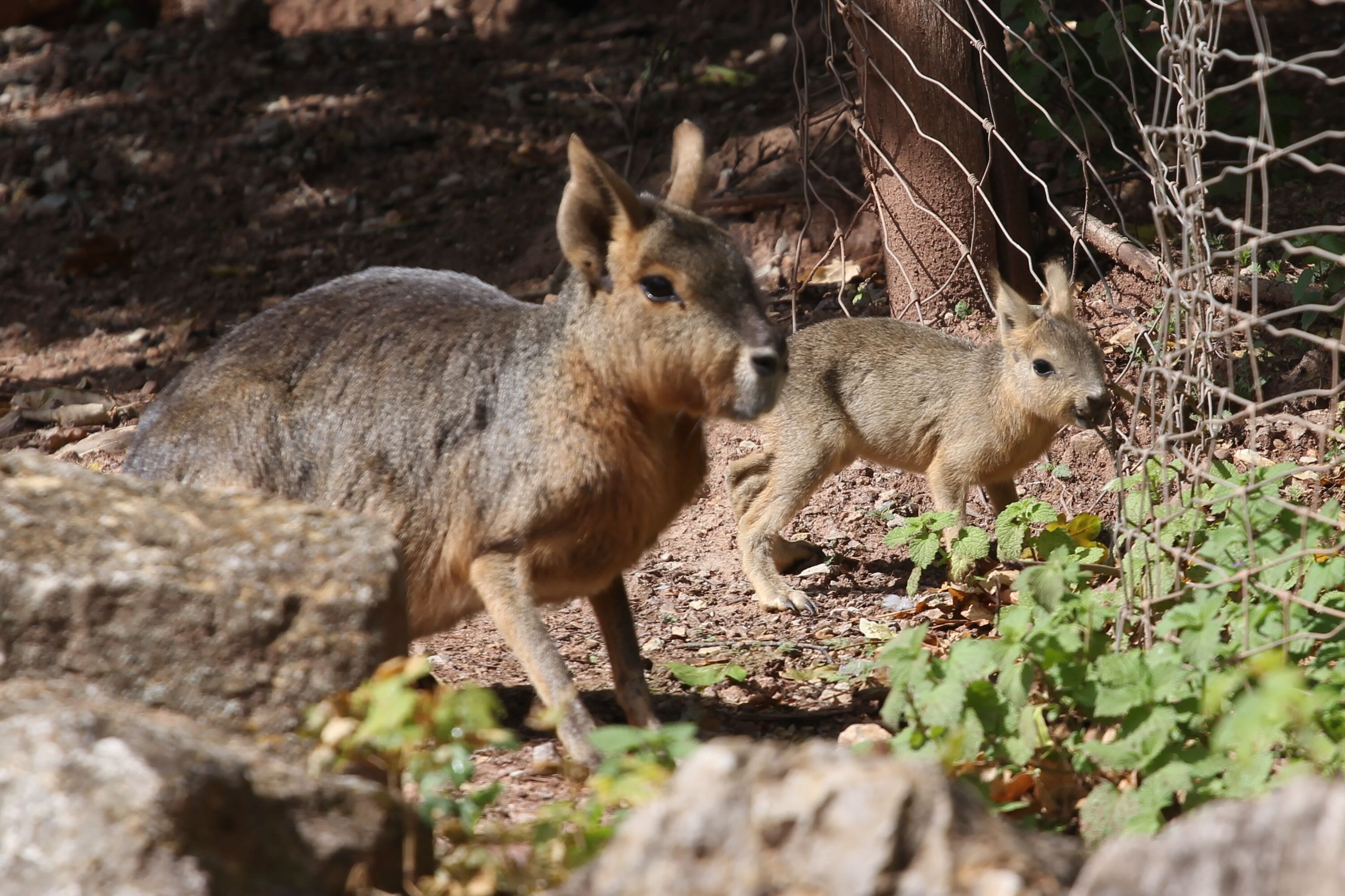 Die großen Maras, auch als Patagonische Mara oder, aufgrund ihres Aussehens, als Pampashase bekannt, haben Nachwuchs. Das Jungtier ist mittlerweile zwei Wochen alt. Es lebt gemeinsam mit sechs ausgewachsenen Maras, mit Lamas und Nandus auf der Südamerika-Freianlage. Immer häufiger verlässt es sein in einer Baumgruppe gelegenes Versteck und ist auf der Anlage zu sehen.