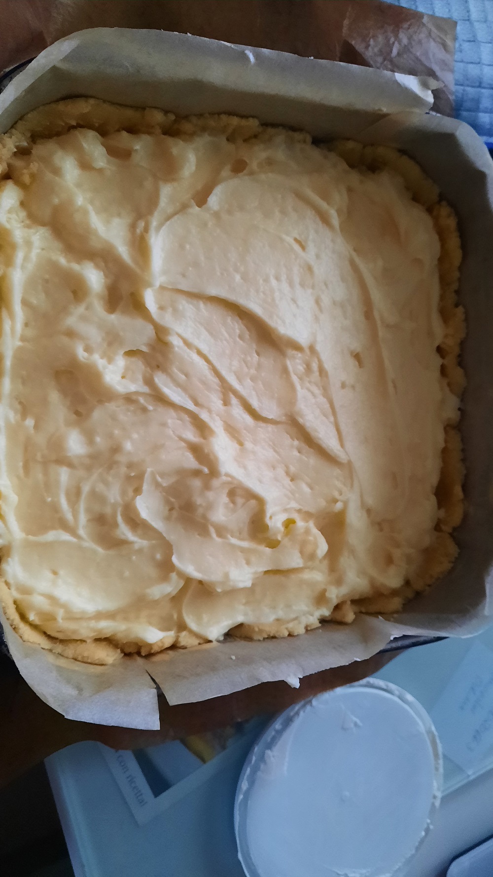 Pudding kochen, Ei unterrühren, abkühlen lassen, aufschlagen und auf den Boden streichen,