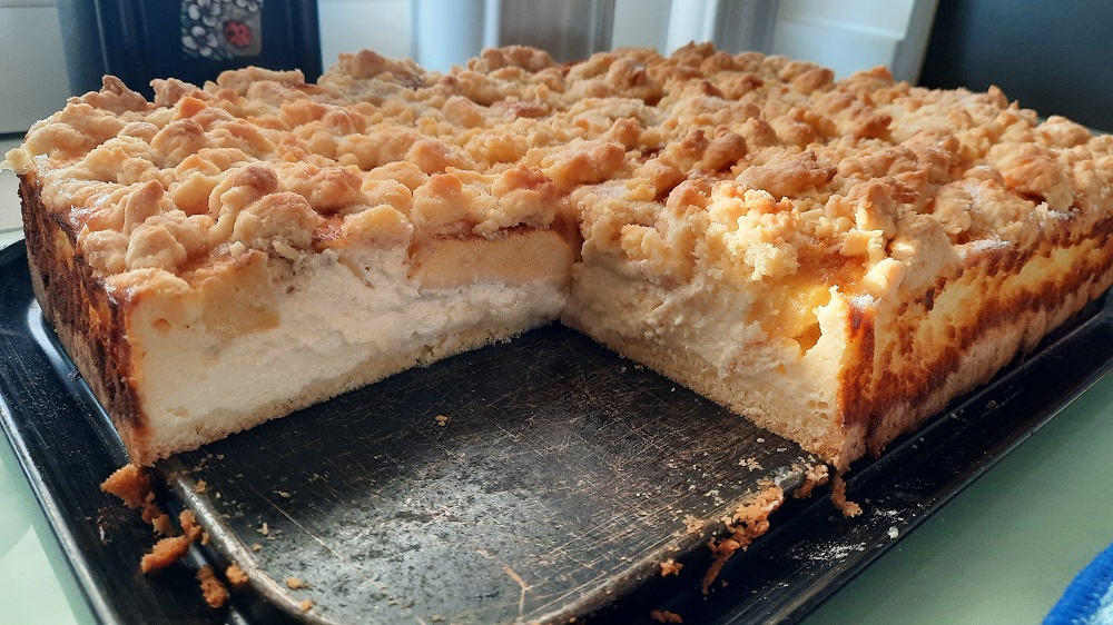 Teig herstellen, halbieren, eine Hälfte als Boden in eine ausgelegte oder gebutterte Form (24x35cm) drücken, in die andere Hälfte 2 EL Mehl für die Streusel einkneten, alle Zutaten der Creme verrühren und auf den Boden geben, Äpfel klein schneiden, mit Zucker und Zimt mischen, auf die Creme legen, Streusel darüber streuen, bei 160°C Ober/Unterhitze ca. 45min backen mit Vanillezucker bestreuen und abkühlen lassen.