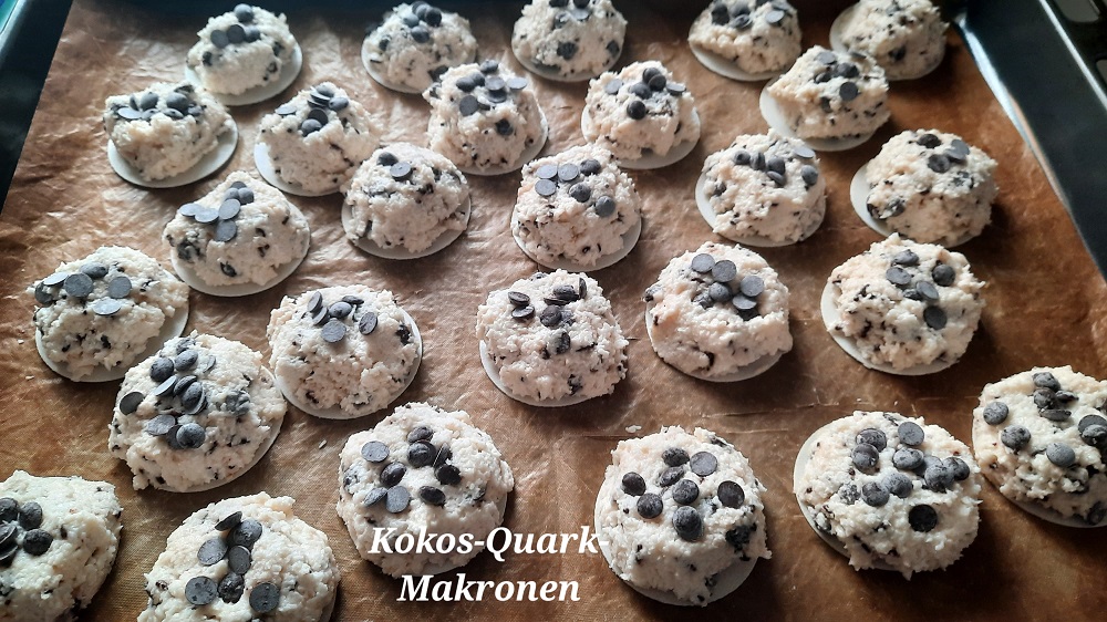 3 Eiweiß, 100g Zucker, 1 Prise Salz, sehr steif schlagen, 100g Quark, 2 Vanillezucker, Zitronenaroma (Schale und Saft einer halben Zitrone), 35g gesiebtes Kartoffelmehl, 200g Kokosraspeln, unterheben, Schokostückchen nach Belieben zugeben, kleine Oblaten auf ein Blech legen und löffelweise die Masse auf die Oblaten setzen, evtl. mit Schokostückchen bestreuen und bei 170 Grad ca. 12-15 Minuten backen.