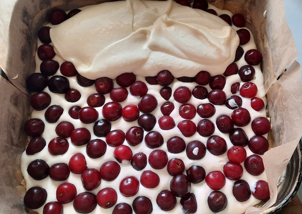 Alle Zutaten verrühren, die Hälfte auf den Teig streichen, mit Sauerkirschen belegen, restlichen Teig darauf streichen, backen bei 175 Grad ca. 45 Minuten.