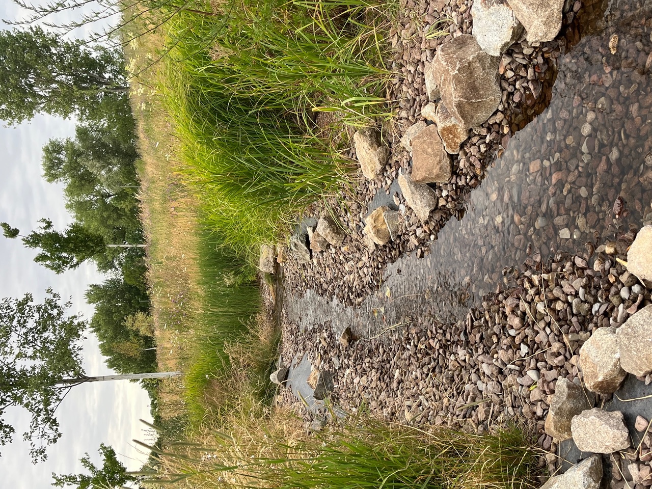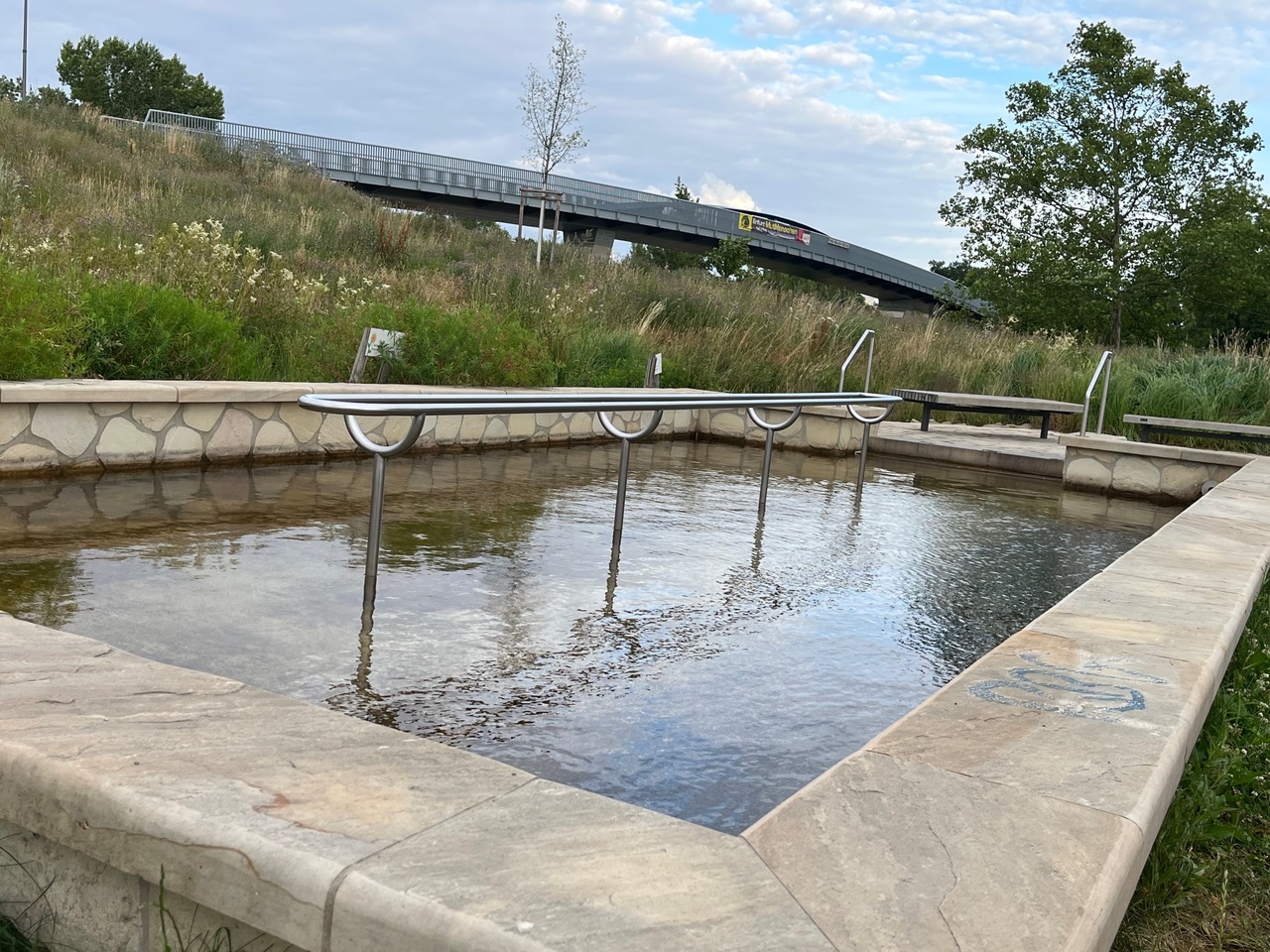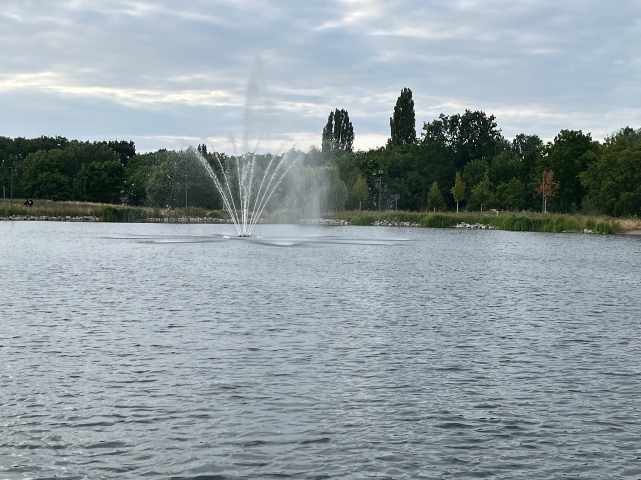Am gestrigen – wohl kühlsten Tag der Woche – haben wir einen Abendspaziergang zum Auenteich unternommen. Der Himmel wolkig-weit, die Luft frisch, fast schon kühl. Jogger, Radfahrer, Hundebesitzer und Mütter mit Kindern waren hier unterwegs. Das Kneipp-Becken – unbenutzt. Die Fontäne in der Teichmitte bietet immer wieder eine schöne Kulisse. Der Freiraum ’22 (Café am See) offeriert am Wochenende Kaffee, Kuchen, Eis und andere Kleinigkeiten.
