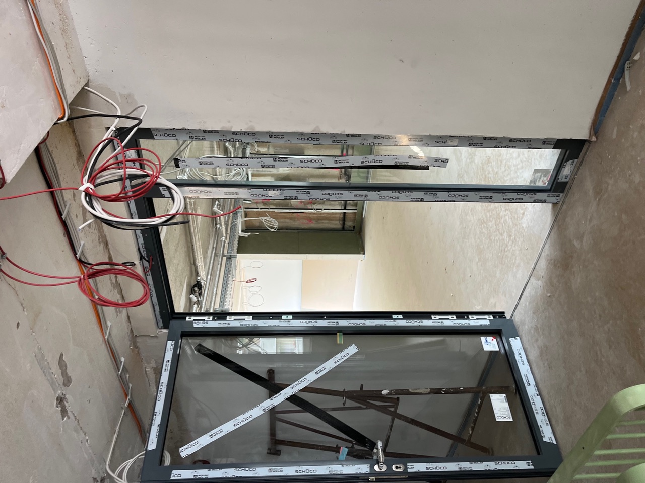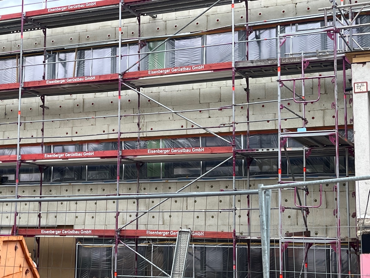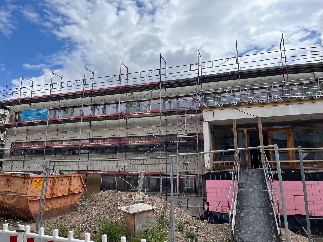 Nachdem das Gebäude in zwei Bauabschnitten entkernt, neue Fenster eingebaut, Türöffnungen verbreitert, ein Schacht für den Aufzug gebaut worden waren, laufen die Installationen aller notwendigen Medien. Im ersten Gebäudeteil (auf der rechten Seite, wenn man vor der Vorderfront steht) ist die Fußbodenheizung verlegt, sind Verbindungstüren eingebaut, die Sanitäranlagen vorbereitet und die Fassade bereits gedämmt, verputzt und farblich sehr ästhetisch gestaltet. Die Fassade des zweiten Bauteils ist bereits mit Dämmung versehen.
