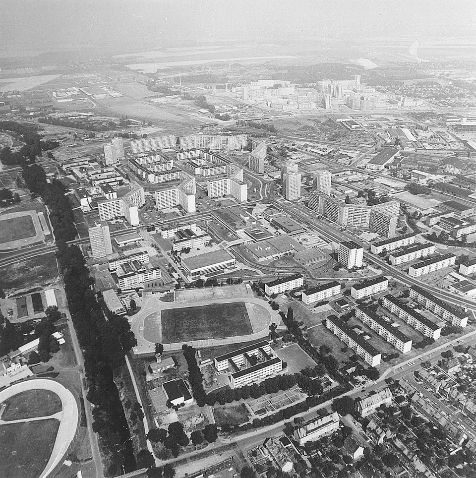Zwei historische Aufnahmen zeigen das Rieth in den 1980er Jahren. Insbesondere die Luftbildaufnahme offeriert den städtebaulichen Ansatz, die klare Gliederung und Strukturierung. Erkennbar ist die Zuordnung von Schulen, Sporthallen und -plätzen, von Kinderkrippen und -gärten, von Kaufhallen, Arztpraxen, Bibliothek und Gaststätten, wie z.B. dem Stadt Vilnius. All das war für die Bewohner schnell erreichbar, vieles fußläufig in kurzer Distanz.