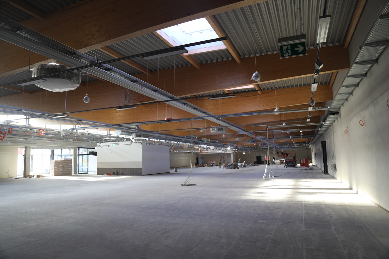 In rund zwei Wochen wird die Ladenausstattung angeliefert, die dann eingebaut und schließlich mit Waren bestückt wird. Der Markt erfüllt alle Ansprüche an eine sehr moderne und zeitgemäße Verkaufsstelle, die mit einer angenehmen Optik für ein schönes Ambiente sorgen wird. Opulente Holz-Dachbinder überspannen den Markt, der jetzt schon – ohne eingeschaltete Beleuchtung – lichtdurchflutet ist.