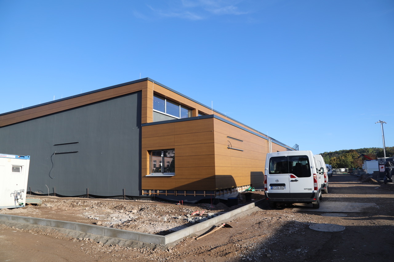 Noch verdecken Fahrzeuge der Handwerksfirmen die lange Fassade des neuen REWE-Marktes, doch in Kürze wird das attraktive Gebäude allen zugänglich sein.