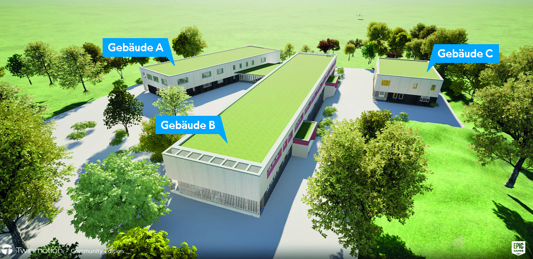 Gebäude C wird als zweigeschossiger Neubau in Holzrahmenbauweise errichtet. Hier findet die schulische Kooperationseinrichtung „Kleeblatt ihr Domizil, in der 14 Kinder im Alter von 6 bis14 Jahren betreut werden, die aufgrund von Beeinträchtigungen ihrer seelischen Gesundheit und einer besonders belasteten Lebenssituation zeitweise nicht am regulären Schulunterricht teilnehmen können.