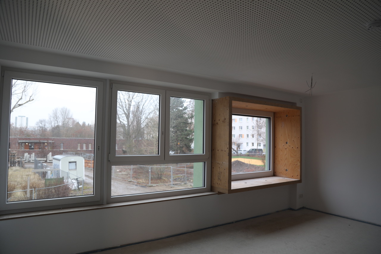Im zuerst modernisierten Gebäudeteil befinden sich derzeit die Ausbaugewerke weiter in Umsetzung. Die Fußbodenheizung ist längst installiert, der neue Zuschnitt der Räume durch Tockenbauarbeiten abgeschlossen. Die Verlegung der Fliesen ist weit fortgeschritten, Malerarbeiten in etlichen Räumen bereits abgeschlossen. In Kürze ist die Verlegung des Bodenbelags vorgesehen.