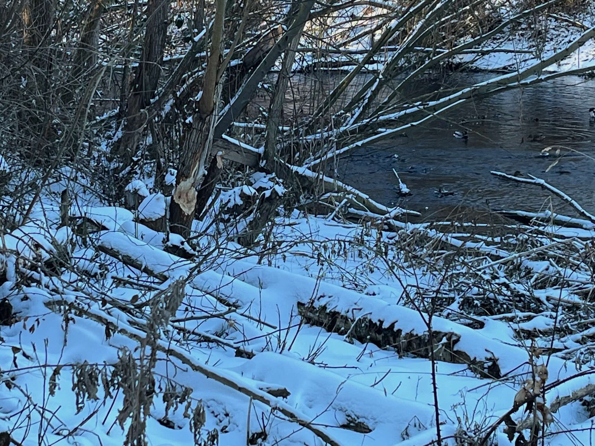 Es war ziemlich kalt, doch in der Sonne glitzerte der Schnee und wir konnten Tiere und die Spuren, die sie hinterließen, beobachten. Im Kiliani Park und auf dem weiteren Weg entlang der Gera Richtung Moskauer Platz, begegneten uns Enten, Graureiher und wir sahen Bäume, gefällt von Bibern. Deren Bestände haben sich durch Schutzmaßnahmen und Auswilderungen deutlich erholt. Die großen Nagetiere sind streng geschützt.