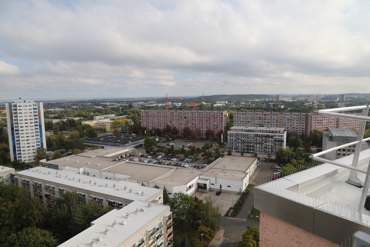 Wir hatten Gelegenheit, vom Dach der Budapester Straße 37 aus auf den Moskauer Platz zu schauen. Unter uns die Moskauer Meile, in kurzer Distanz die ehemalige Poliklinik Nord, heute Ärztehaus am Moskauer Platz, die Elfgeschosser der Rigaer Straße.