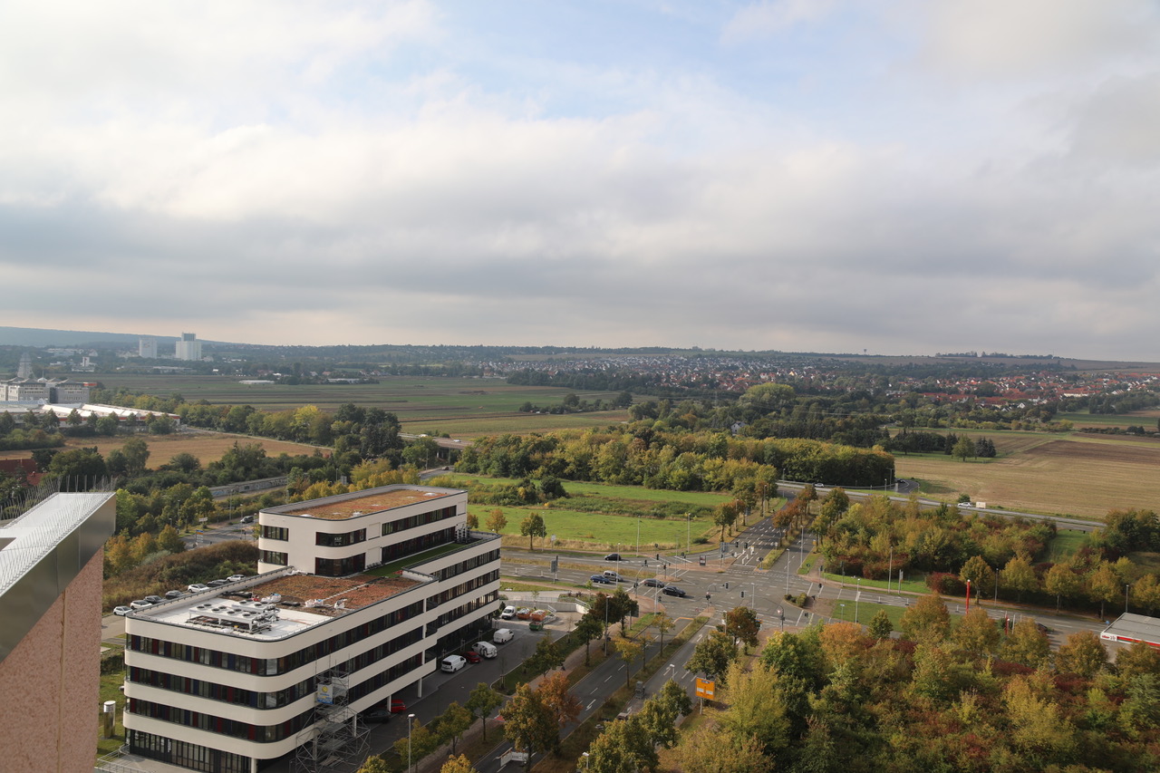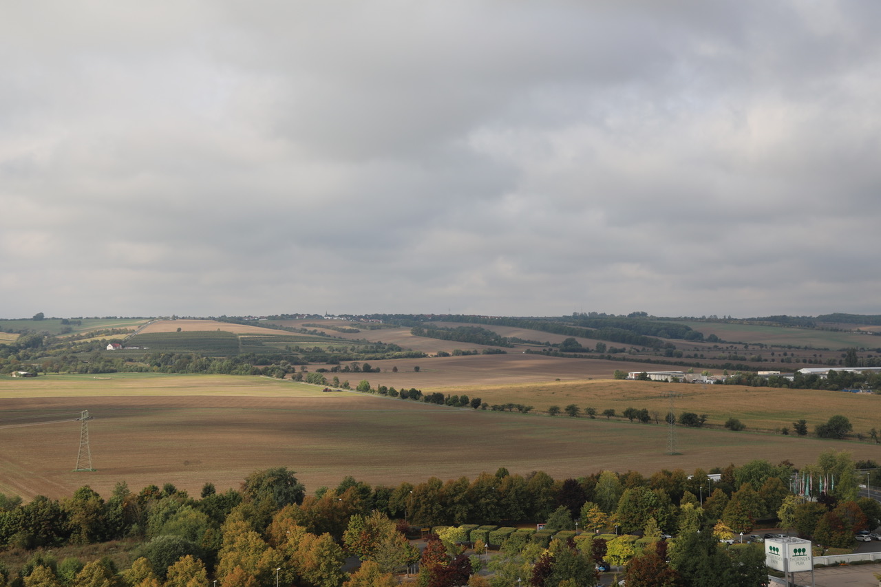 Auf der anderen Seite der Nordhäuser Straße das neue Ärztehaus, unweit vom Thüringen-Park gelegen. Lässt man den Blick in die Ferne schweifen, sieht man die Fahnerschen Höhen vor weit sich breitenden Feldern.