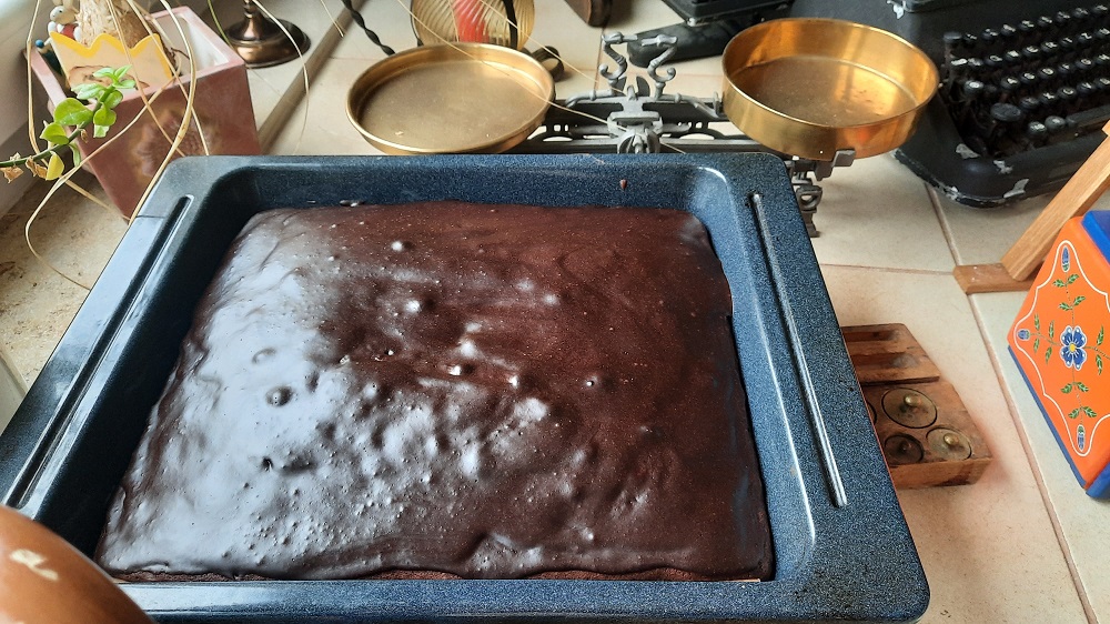 Teig: 250g Sahna oder Butter, 300g Zucker, 4 Eier, 1 Prise Salz, 1 Becher Saure Sahne, 50g Kakao, 7g Natron, 360g Mehl,