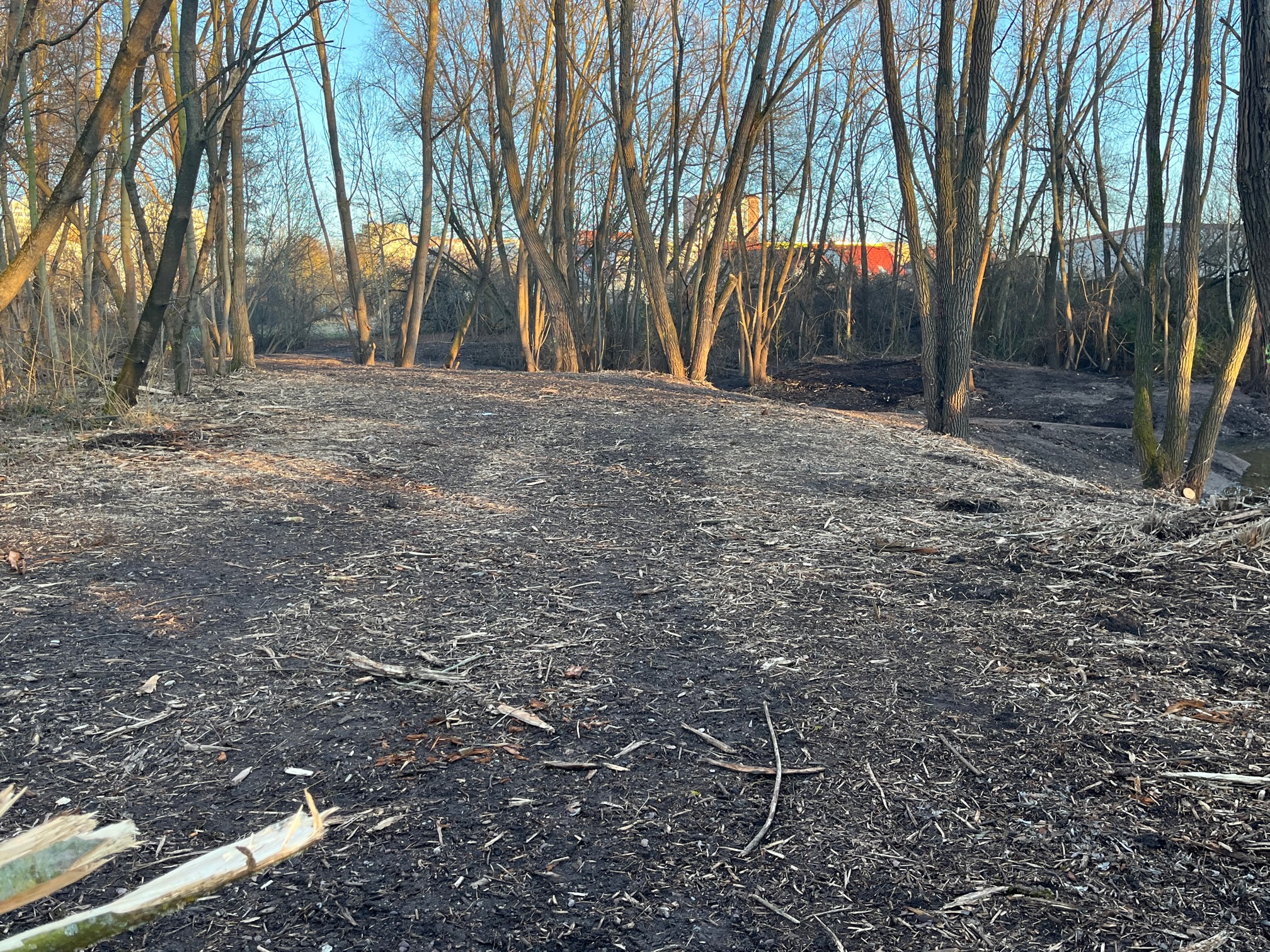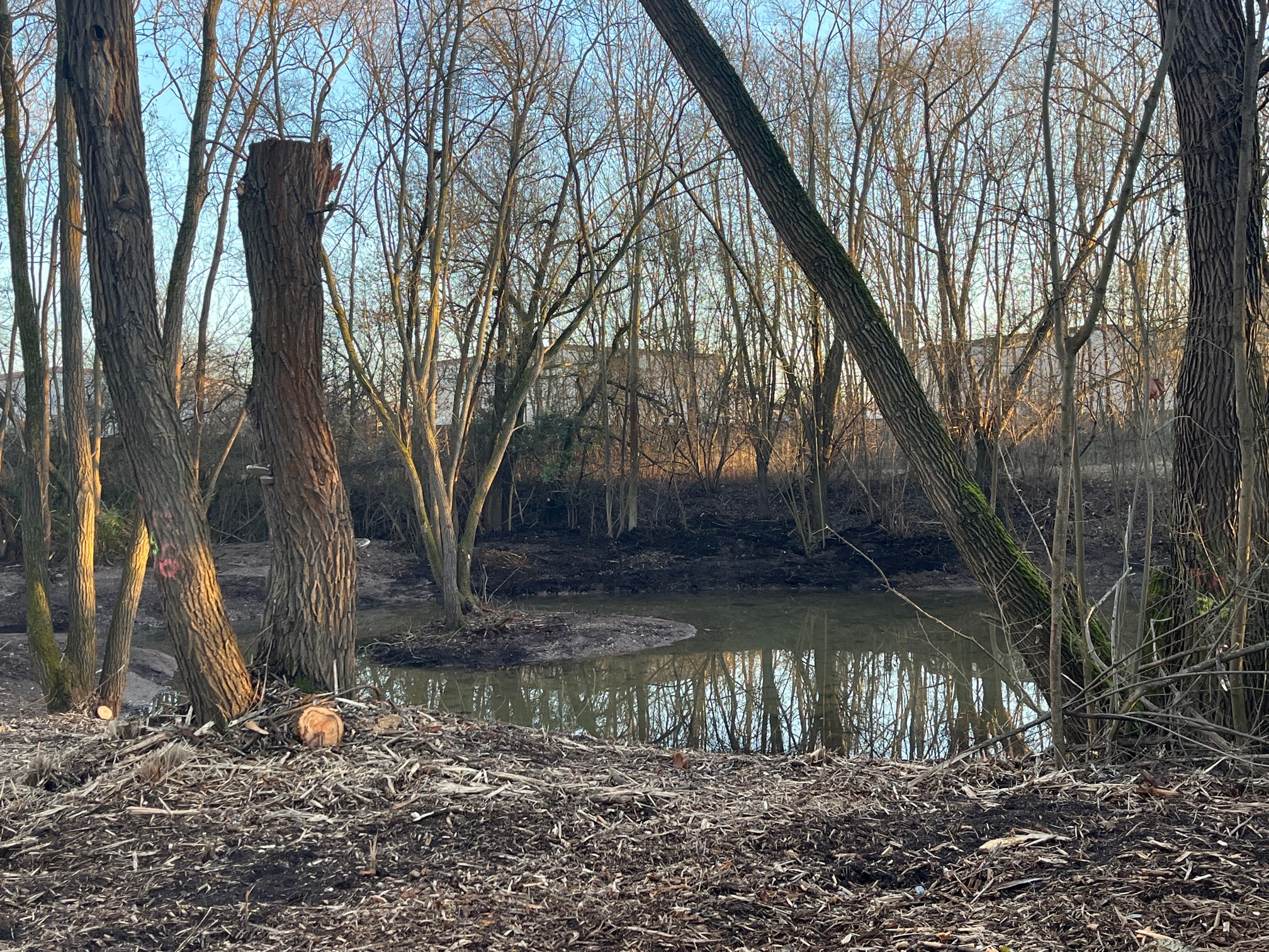 Jetzt wurden große Mengen Schlamm ausgebaggert, die Gehölze stark zurückgeschnitten, Wildwuchs entfernt, die Uferbereiche begradigt. Letztere sind nicht zugänglich, um das ökologische Gleichgewicht hier nicht zu stören.