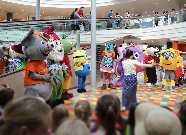 Maskottchen-Parade im Thüringen-Park: Erno unter den bekannten Figuren aus den Medien