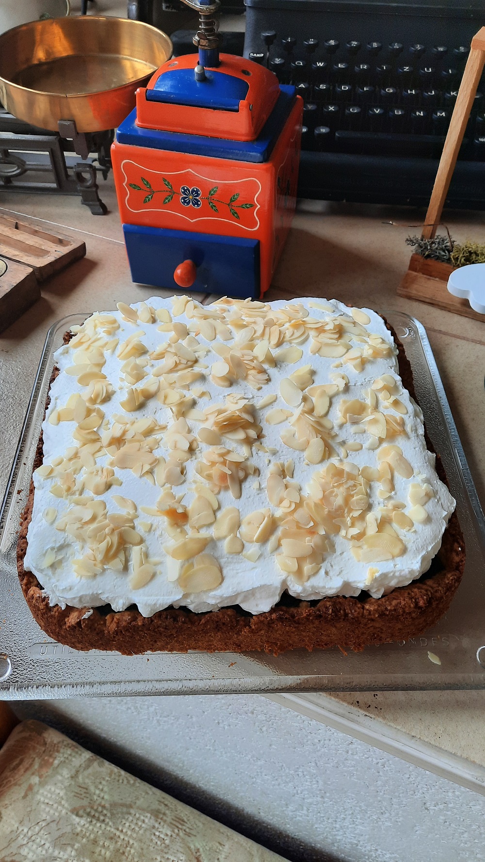 Haube: Sahne steif schlagen, Quark mit dem Puder- und Vanillezucker verrühren, vorsichtig beides verrühren (evtl. etwas Sahnesteif zugeben), auf dem Kuchen verteilen, bis zum Servieren kalt stellen, mit gerösteten Mandelblättchen bestreuen.