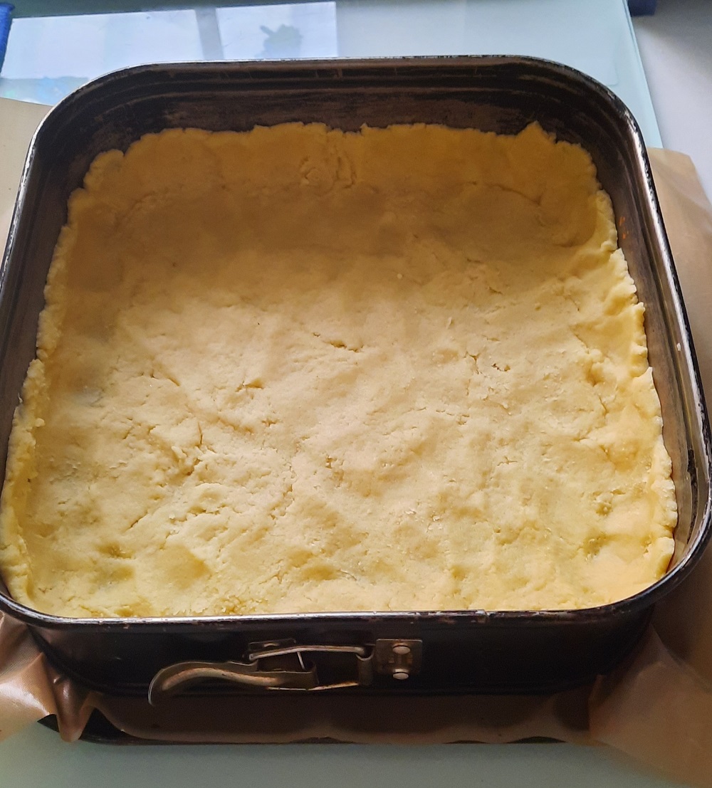 Teig in eine gebutterte Form (27/27cm) drücken, Rand hochziehen, ein paar Mal mit einer Gabel einstechen.
