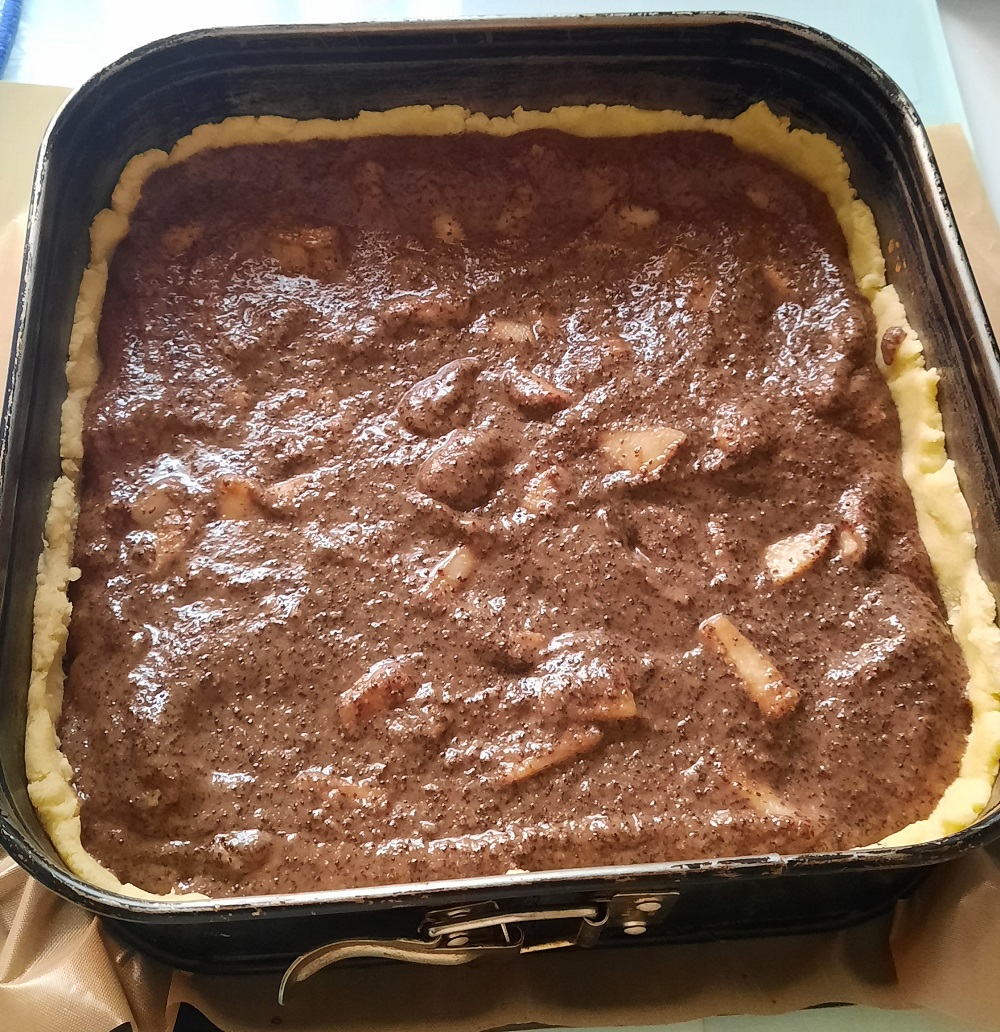 Apfelmus und Birnen unter die Mohnmischung heben und auf dem Teig verteilen. Bei 75-180 Grad O/ U ca. 40 Minuten backen, abkühlen lassen.