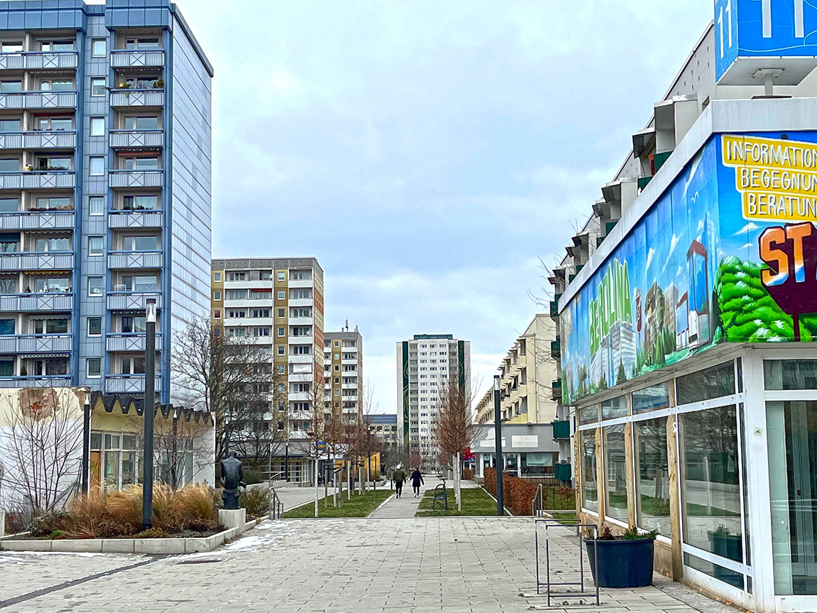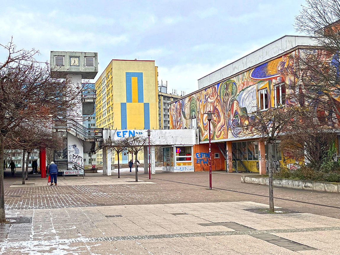 Wir haben gestöbert und eine Postkarte mit sonnigen Bildern unseres Stadtteiles zutage gefördert. Und wir haben die hier abgebildeten Bereiche aktuell noch einmal fotografiert. In den 1980er Jahren war das Grün im Rieth und am Berliner Platz noch zurückhaltend, dafür gab es gepflegte Hochbeete und Schalen mit üppig blühenden Pflanzen.