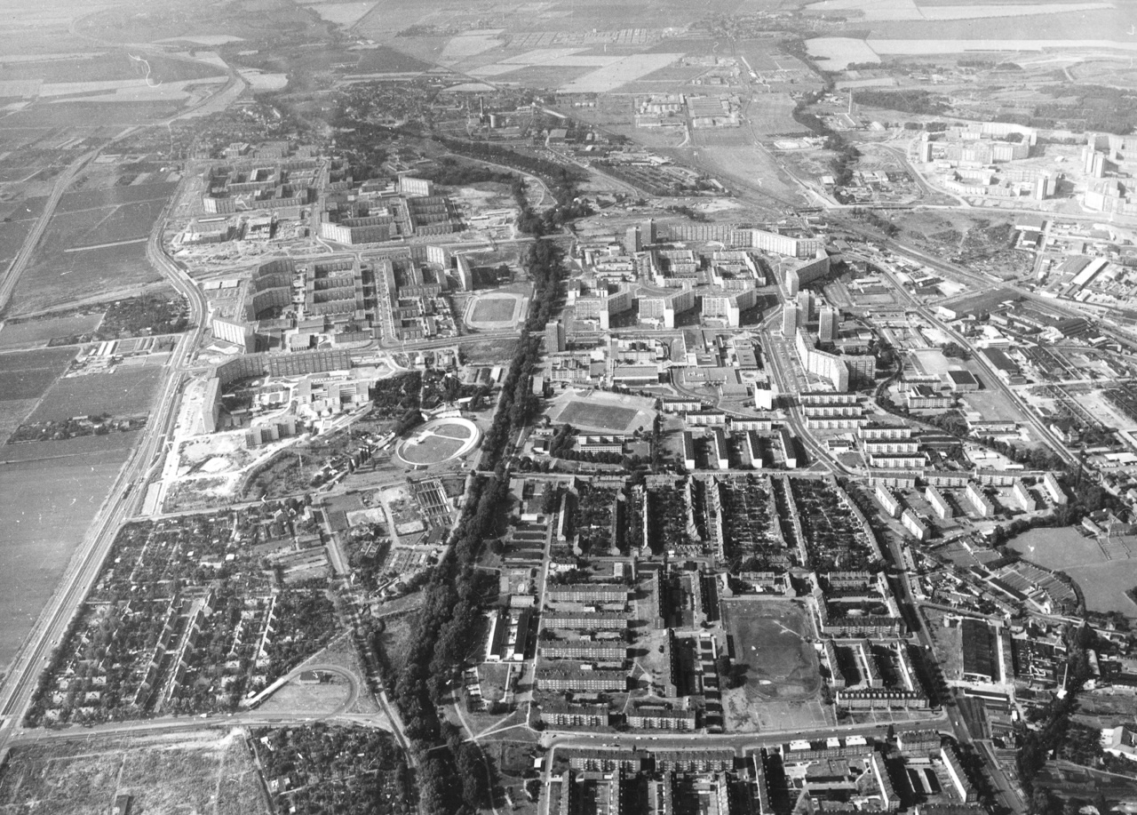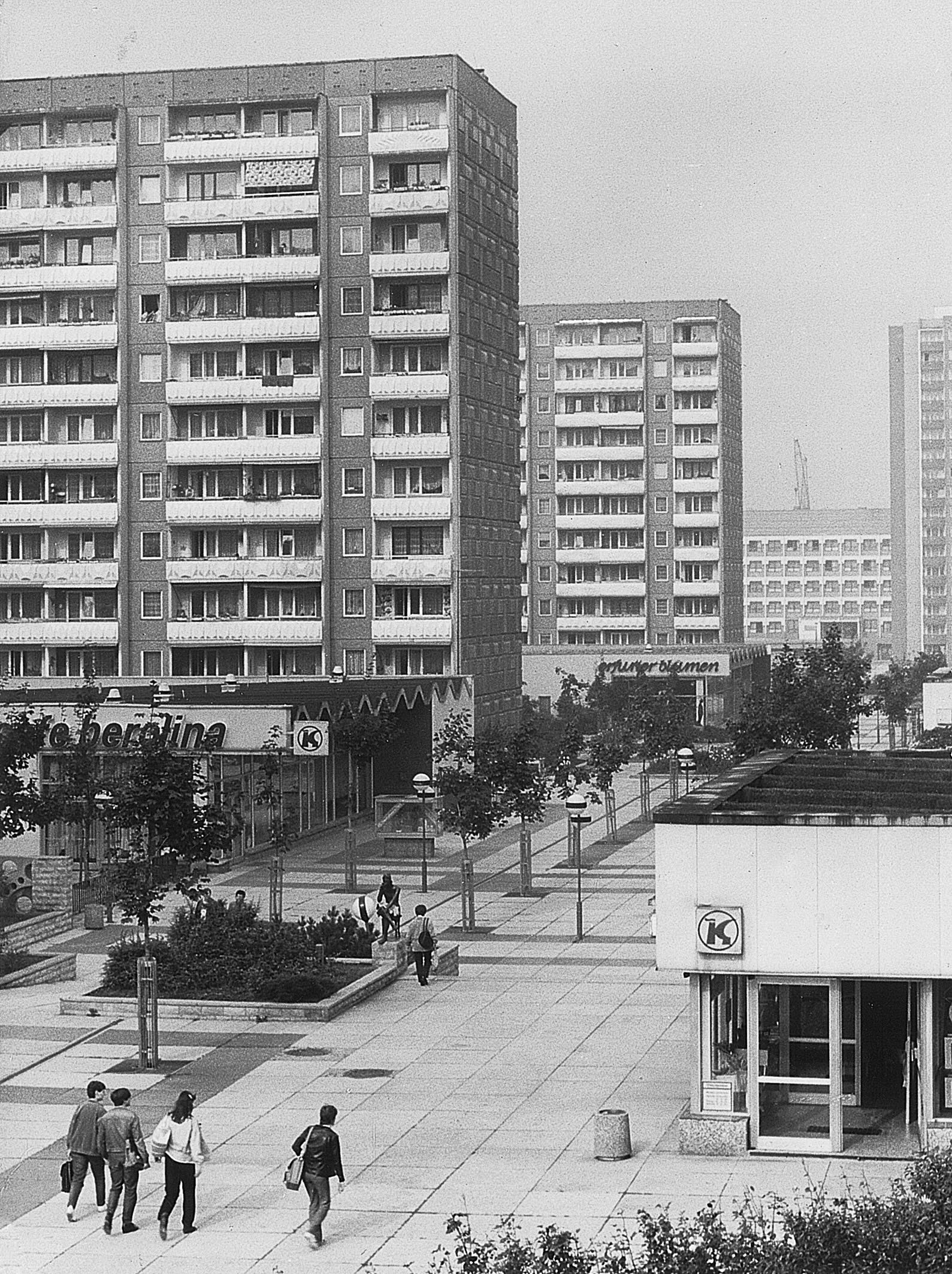 Der Berliner Platz war einst in seiner städtebaulichen Anlage attraktiv und für die 1980er Jahre, in denen er entstand, wegweisend. Pavillons – kubische Flachbauten – beherbergten entlang der Fußgängerzone Geschäfte, Bibliothek und auch ein Café – das Berolina.