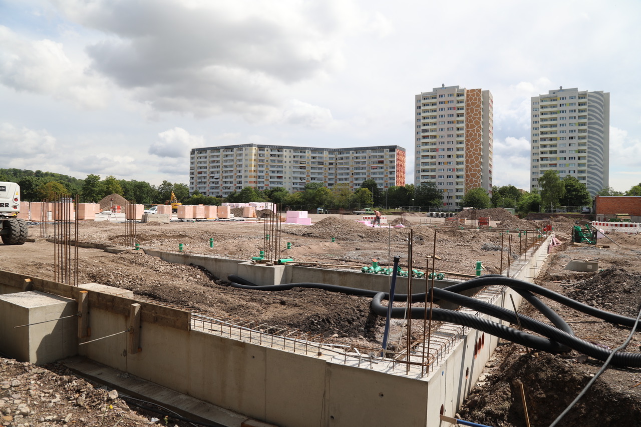 Der Bau des Einkaufszentrums am Roten Berg schreitet voran. Inzwischen ist die Bodenplatte für den künftigen REWE-Markt fast fertiggestellt.