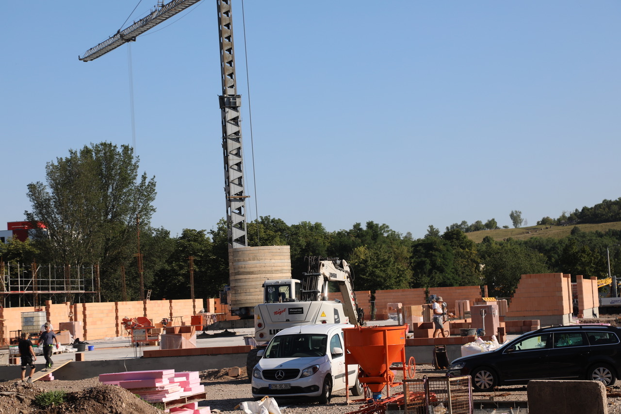 Kaum wurde die Bodenplatte für den neuen REWE-Markt, der wichtiger Teil des neuen Einkaufszentrums am Roten Berg sein wird, fertig gestellt, hat bereits der Hochbau begonnen. Die Außenwände werden zügig erstellt.